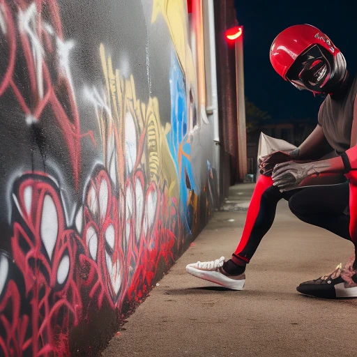 A black man in a red helmet and dark red lycra outfit, doing graffiti at night with a spotlight on him.