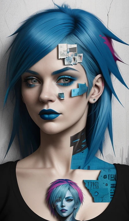 woman with blue hair, in the style of multi-layered collages, edgy street art, celebrity-portraits, cardboard, fragmented icons, realistic hyper-detail, crossed colors --ar 73:111 --stylize 750 --v 6