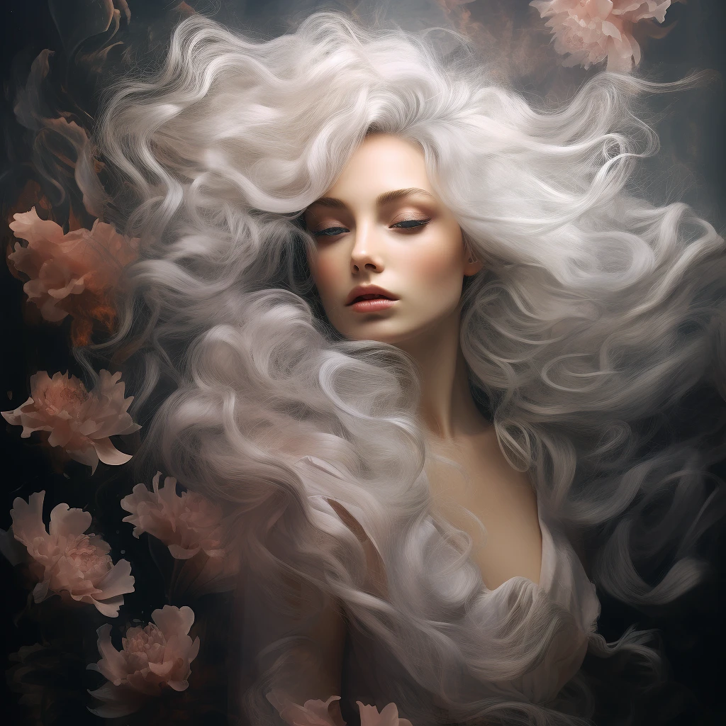 A portrait of a woman floating in a dark void, eyes closed painterly style, masterpiece dark colors with bioluminescent highlights. Floating wavy hair, Elegant botany and flowers. Smoke fractals, hauntingly beautiful