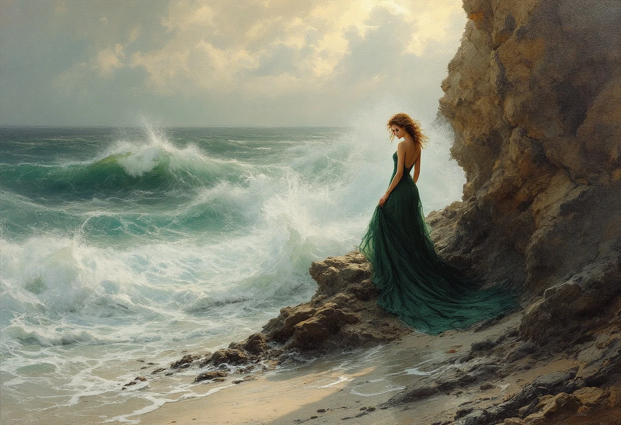 Pintura a oleo mulher solitária em um penhasco à beira-mar, ao entardecer, usando um vestido longo esvoaçante em tons de verde musgo, cabelo solto ao vento. O mar está agitado e o céu dramático, com nuvens carregadas. Pintura no estilo pré-rafaelita de John William Waterhouse, com foco nos detalhes do tecido e da natureza ao redor. painting by John William Waterhouse --niji 6