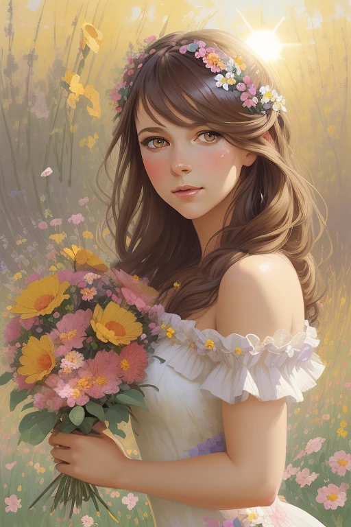 commercial illustration of a woman dressed in flowers with flowers in her hair, in the style of artgerm, vibrant palette knife, franciszek starowieyski, michael malm, captures the essence of nature, sun-kissed palettes, illustration --ar 58:77 --s 750 --style raw