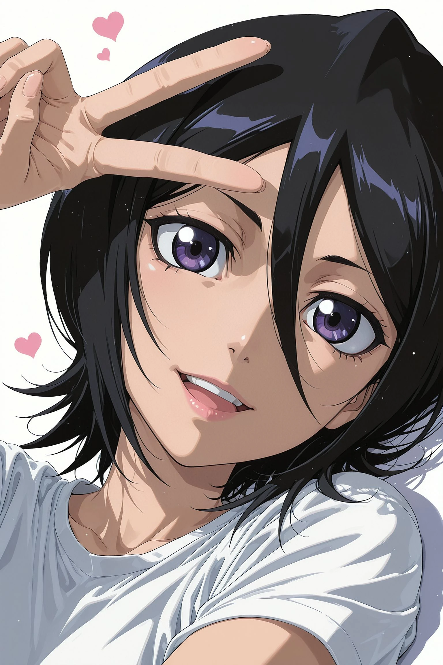 close-up, portrait, 1girl, kuchiki rukia, black hair, short hair, hair between eyes, purple eyes, detailed eyes, pink lips, smile, upper teeth only, white t-shirt, lying, minimalist background, white background, looking at viewer, soft shadows, soft shading, heart, v, masterpiece, best quality, anime coloring