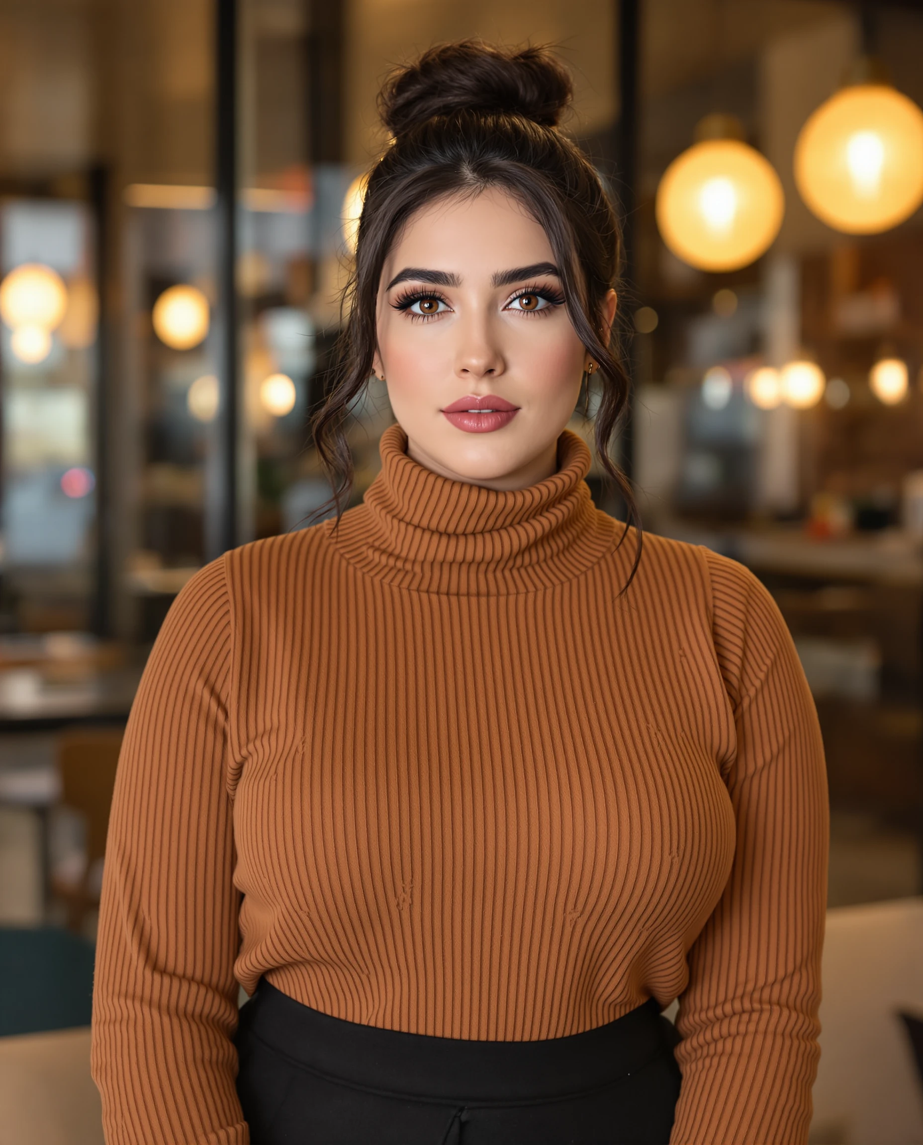 (wearing a warm-toned ribbed turtleneck sweater, snug fit highlighting form, paired with a high-waisted midi skirt with soft pleats, standing against a modern café backdrop with warm glowing lights, slight reflection on glass windows, front view, soft and natural lighting maintaining depth and clarity:1.2)