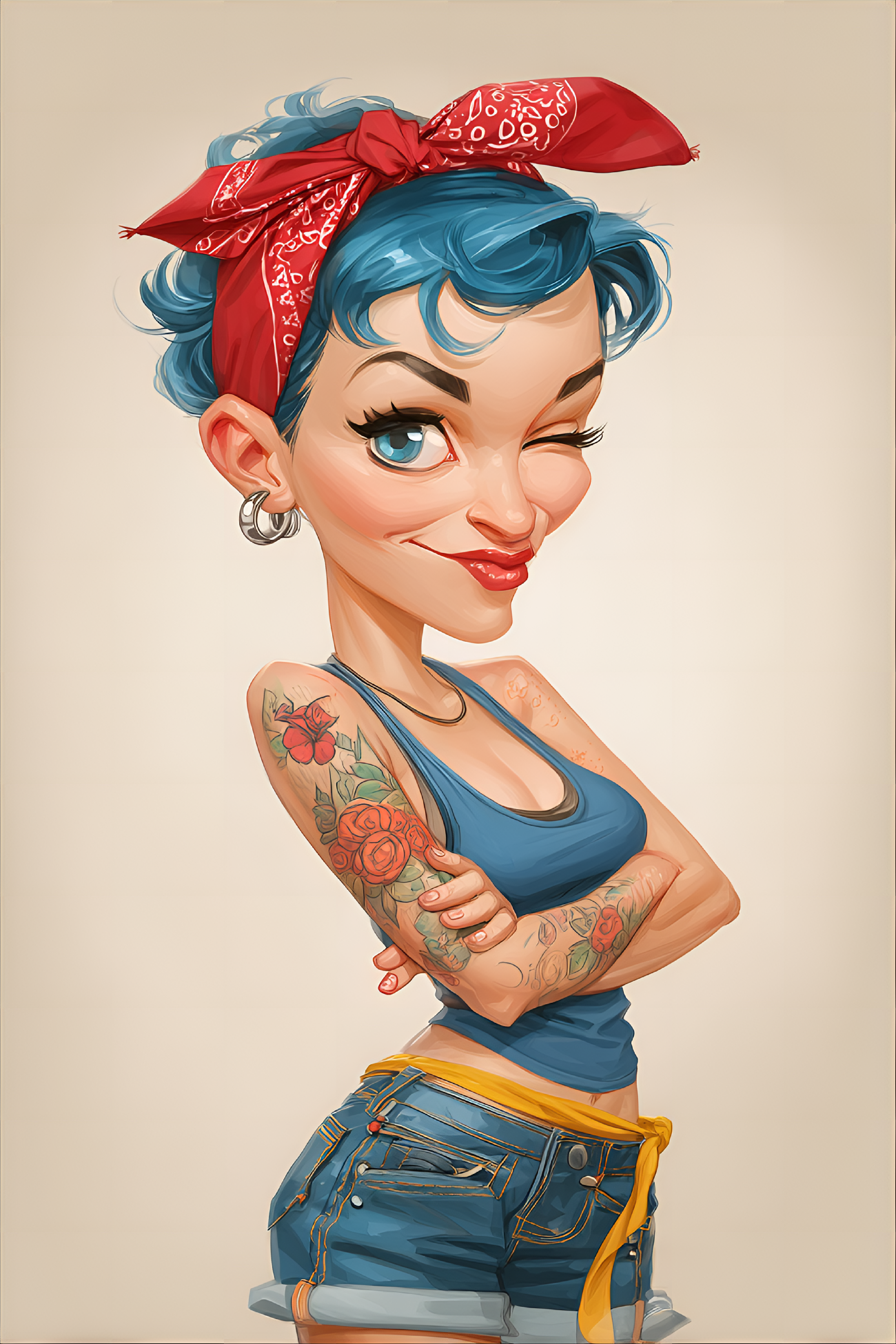 funny caricature, retro pin-up girl caricature, young caucasian female, 25 years old, blue hair, tattooed arm, piercing gaze, big cartoonish head, exaggerated caricature features, winking expression, wearing red bandana, blue tank top, denim shorts, hands on hips pose, digital painting caricature style with vibrant colors, smooth gradients, glossy highlights, whimsical, playful
