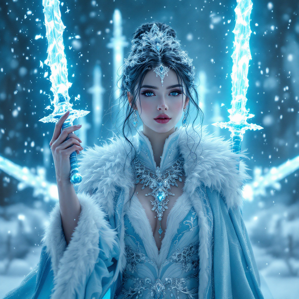 A stunning woman in an icy blue and silver robe adorned with intricate frost-like patterns and shimmering jewelry. Behind her, swords made of ice and jade float in the air, glowing with a cold, mystical light. Snowflakes gently fall around her, and a soft icy mist swirls in the background, creating a serene yet powerful winter atmosphere. Ultra-detailed, 8K, cinematic composition.