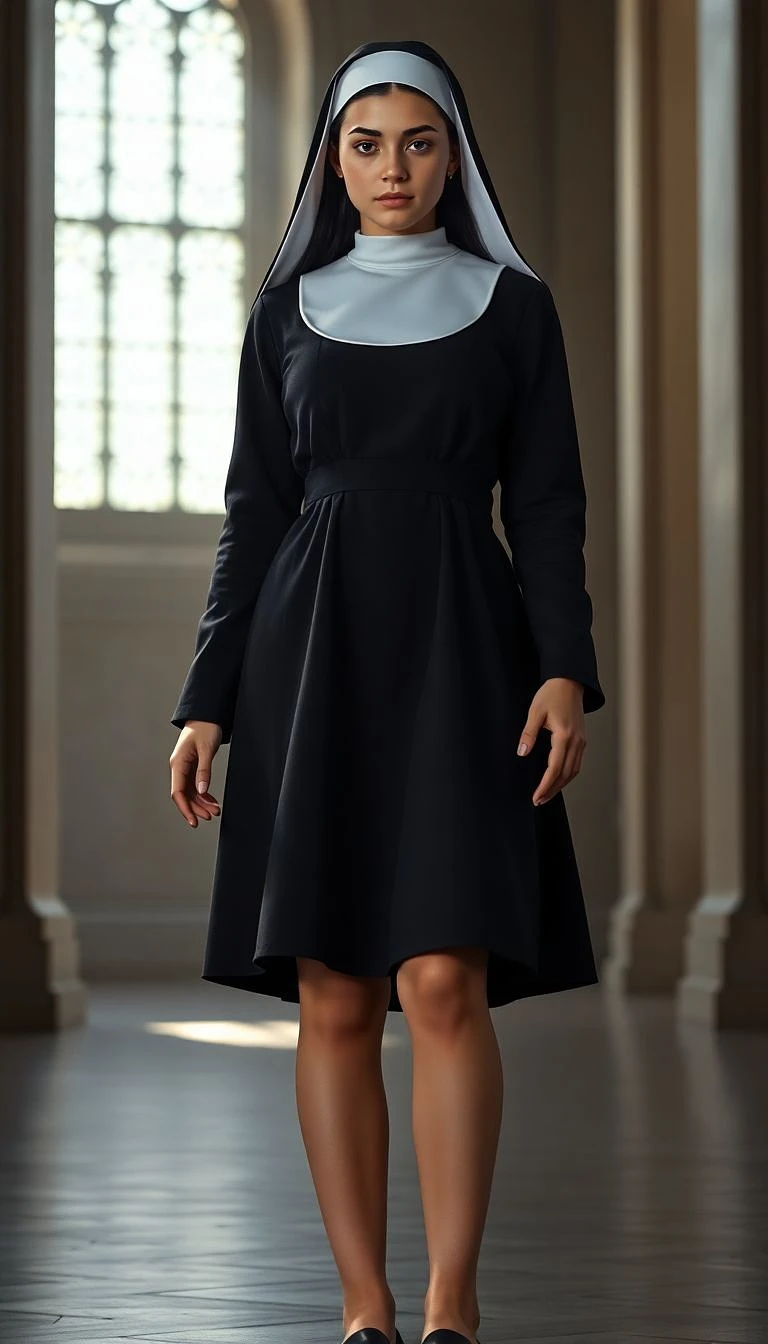 Hyper realistic full body view of beautiful 14yo nun, indigen Face, long legs, Long Black Hair, very big breastet, Wide hips, delicate hands with long slender Ifingers, young catholic nun, pretty, cute face, Short skirt, Black straps, Lackschuhe, frontal view, ray of light breaking the shadows of a church, 8k wallpaper, UHD, perfect lighting, masterpiece, dramatic, photorealistic, finely detailed, shadows, large, Full Body Picture show her feet