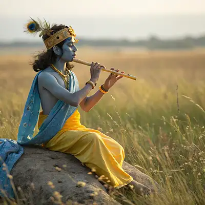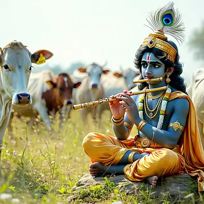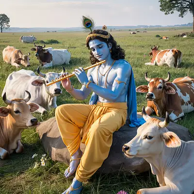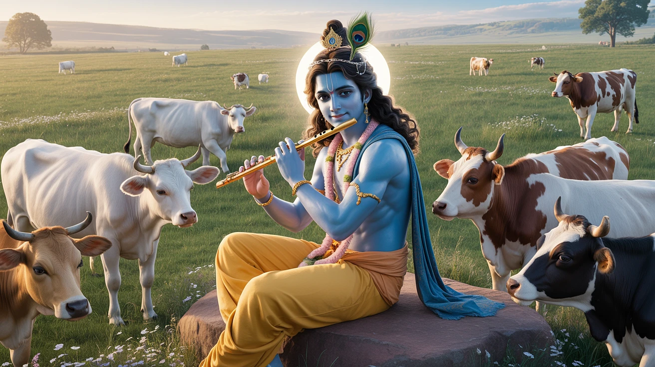 A hyper-realistic, cinematic scene of Lord Krishna as a divine teenager around 15 years old, seated on a large rock in the middle of a wide, sunlit grassy field. He has light blue skin with a soft divine glow, youthful features, and long wavy dark hair adorned with a golden crown and a glowing peacock feather. He wears a yellow silk dhoti and a simple blue shawl, along with minimal golden jewelry. Krishna holds his flute gently, resting it on his lap, with a serene and thoughtful expression. Surrounding him are cows of various colors—white, brown, and spotted—calmly grazing, lying down, and gently nuzzling near him. Some cows look at him with affection, symbolizing divine connection. The field stretches into the horizon with patches of wildflowers, soft breezes moving the tall grass, and a few trees scattered in the distance. The sky is clear with warm golden sunlight. The atmosphere is serene, spiritual, and grounded in pastoral beauty—capturing Krishna’s divine youth as the beloved cowherd of Vrindavan