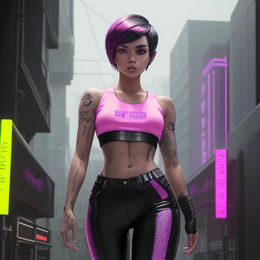 Cyberpunk binary code tattooed freckled net runner Filipina girl, sporty, fit body, eleven line abs, cropped very short pixie cut black and pink hair, Full body, glamour, looking at the camera, wearing leather pants and tight white crop top, workout, shot while walking in a Cyberpunk city, hyper detailed eyes, violet eyes, hyperdetailed painting, luminism, 4k resolution, fractal isometrics details bioluminescens , 3d render, octane render, intricately detailed , cinematic, trending on artstation Isometric Centered hypereallistic cover photo awesome full color, hand drawn , gritty, realistic highly intricate, hit definition , cinematic, Rough sketch, bold lines, on paper, full body composition. Sweet perfect face ((intense freckles) ) inspired by cyberpunk 2077 and blade runner, perfect breasts, perfect anatomy, upclose