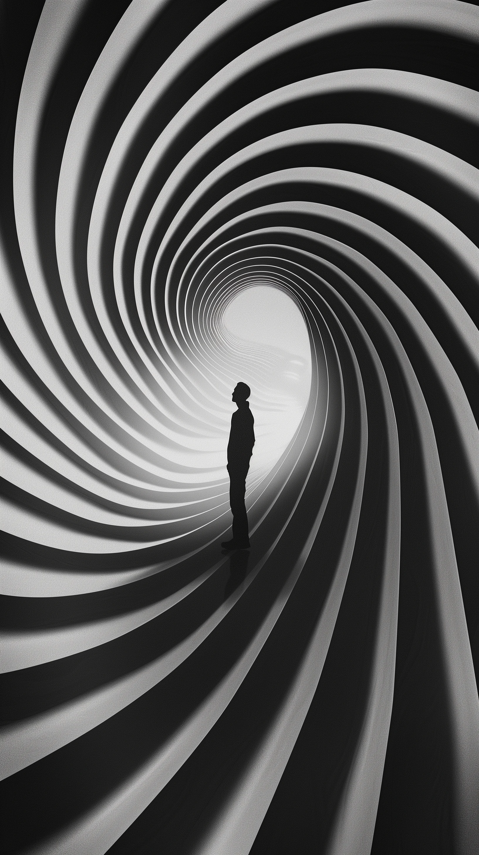abstract monochrome spiral drawing dominates the frame, its lines curving inward to a vanishing point that coincides with the silhouette of a lone figure standing at the center, creating a deep visual tunnel effect, the stark contrast and hypnotic pattern draw the viewer's eye directly to the figure, evoking a sense of mystery and infinity --ar 9:16 --style raw
