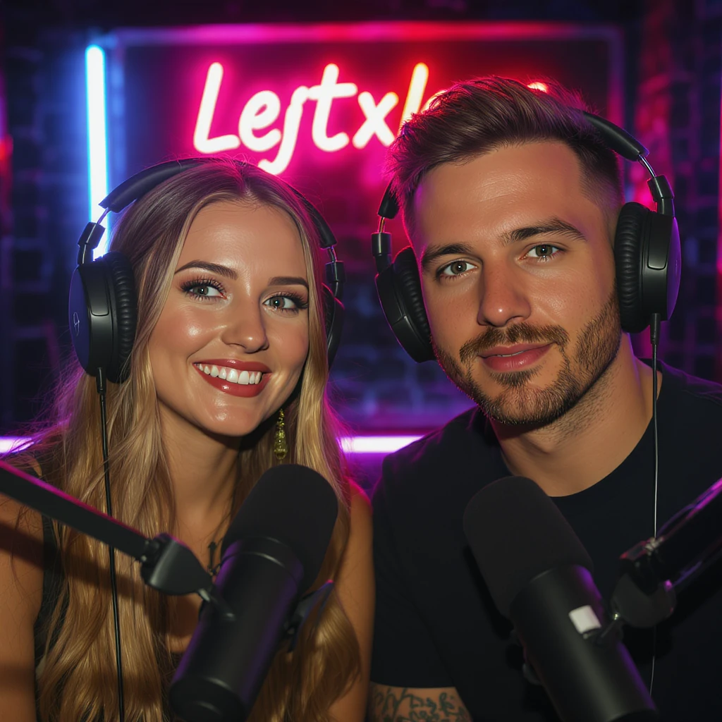 Close-up of two Male and female podcast hosts in front of studio mics, blurred neon lights in background, podcast headphones, cinematic lighting, clean influencer aesthetic, detailed facial features, camera facing’s the avatare