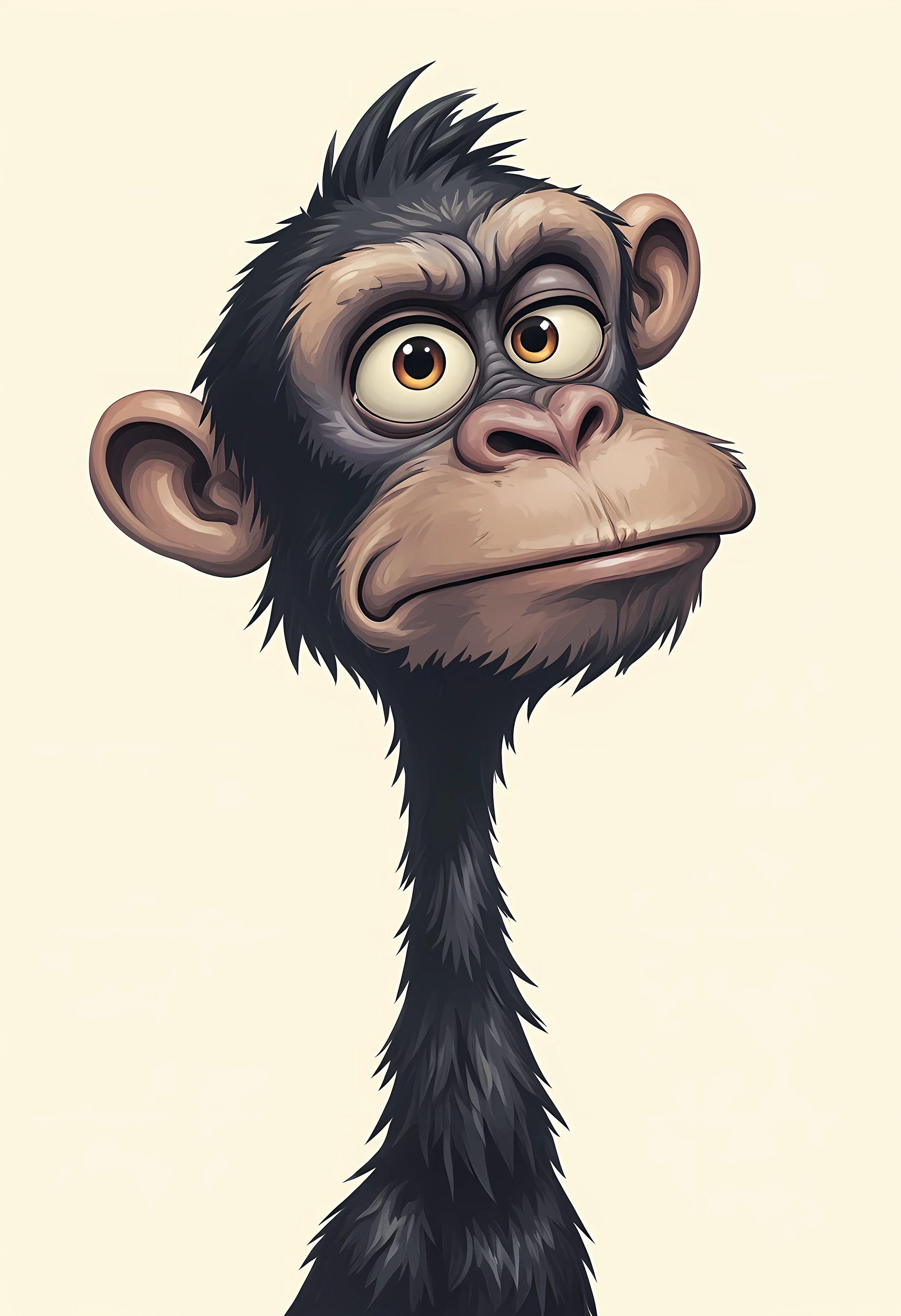 A whimsical, cartoon-style portrait of a zesty Chimpanzee with exaggerated facial features, including large, droopy eyes, a prominent beak, and a long neck. The bird's furrowed brow and slightly disheveled feathers add to its quirky expression, giving it a humorous and expressive appearance against a plain background.