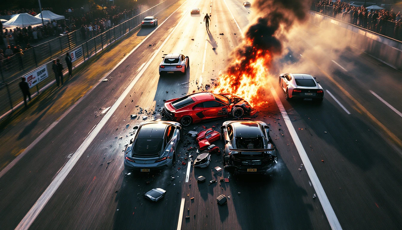 The race track is well lit by sunlight. Tensions are rising. EMERGENCY on the track! There has been an accident on the track ahead, two cars have collided and the damaged ones are standing on the track partially blocking the track. Broken parts of the cars are lying around the cars. There is no fire. The two cars have to maneuver sharply to avoid the collision. There are no other cars on the highway. Spectators stand behind the track fence. The camera looks sideways and slightly overhead and pans behind the passing automobiles. Cyberpunk style.