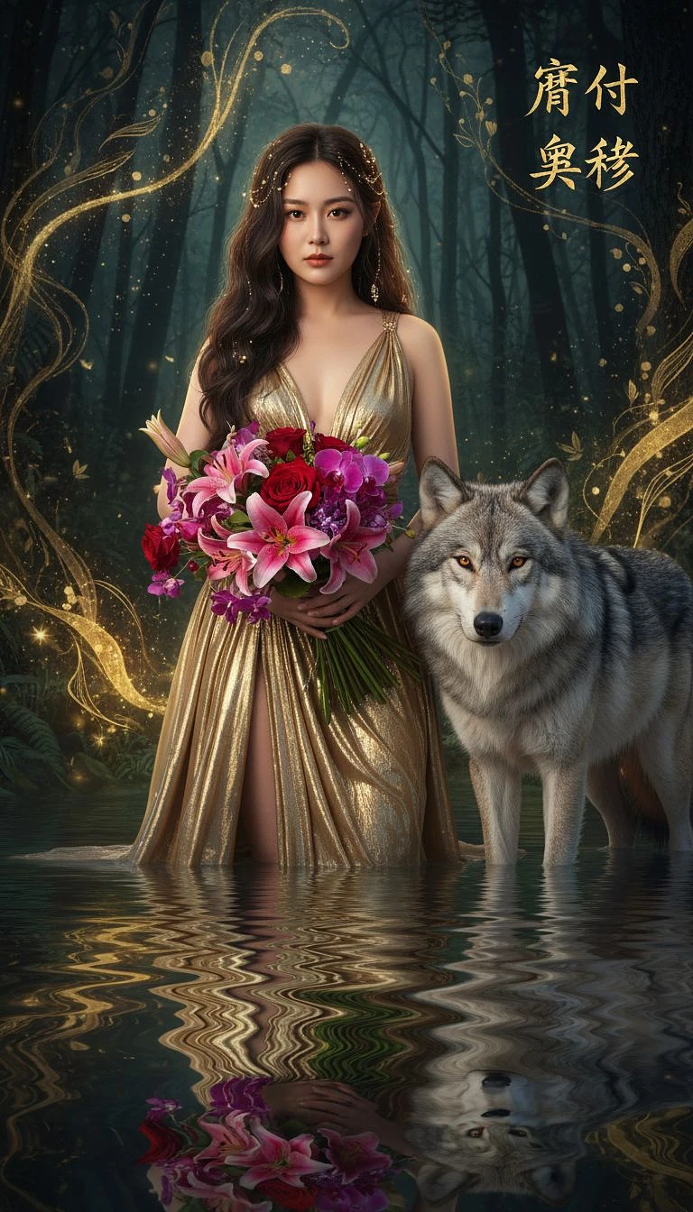 The image depicts a beautiful woman with olive skin standing waist deep in water ((beside a large wolf) ). The woman has long, flowing brown hair adorned with decorative elements and is wearing a shimmering revealing gold dress. She holds a bouquet of vibrant flowers, including pink lilies and other colorful blooms, which are reflected in the water below. The background features a dark setting with golden accents that resemble foliage or sparkles. In the top right corner, there are Chinese characters: "Potential" and "Mystery. "