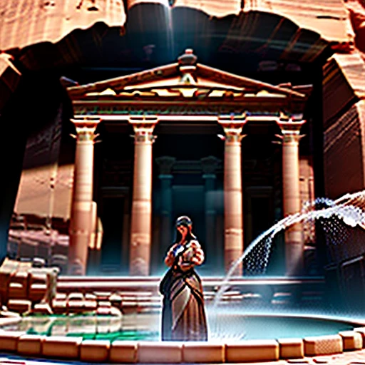 a beautiful lady standing in front of the Treasury in Petra with water pouring, in the style of gongbi, mysterious backdrops, unreal engine 5, smooth and curved lines, photo-realistic --ar 61:128 --s 750 --v 5. 2