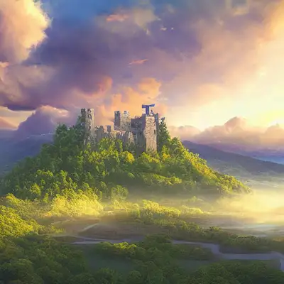 Giant flying island in the sky, a towering castle on the island, colourful clouds, dawn utopia landscape meadow, a beam of light ascending from the clouds into the town centre, mountain, perfect view, hd, ultra intricate, golden hour view scenery, ultra realistic, god ray, ray tracing, composite vista photograph vista photograph,cinematic lighting, digital painting, fantasy, masterpiece