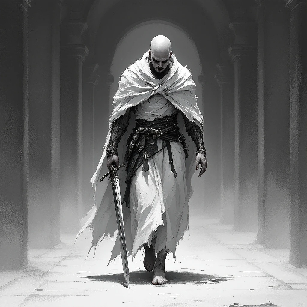 n image of a full body male bald guy with white cloak, bare foot and a sword in his hand, crying while walking through a hall, in the style of speedpainting, dark white and dark gray, high contrast, blackwork tattoo style, character studies, dom qwek, nihilcore, wlop, iconic --ar 4:5 --s 250