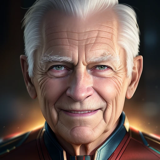 photograph close up portrait 85-year-old Captain Marvel, clean shaven, kindly smiling at camera, stoic cinematic, 4k, epic detailed, shot on kodak, detailed, dark moody
