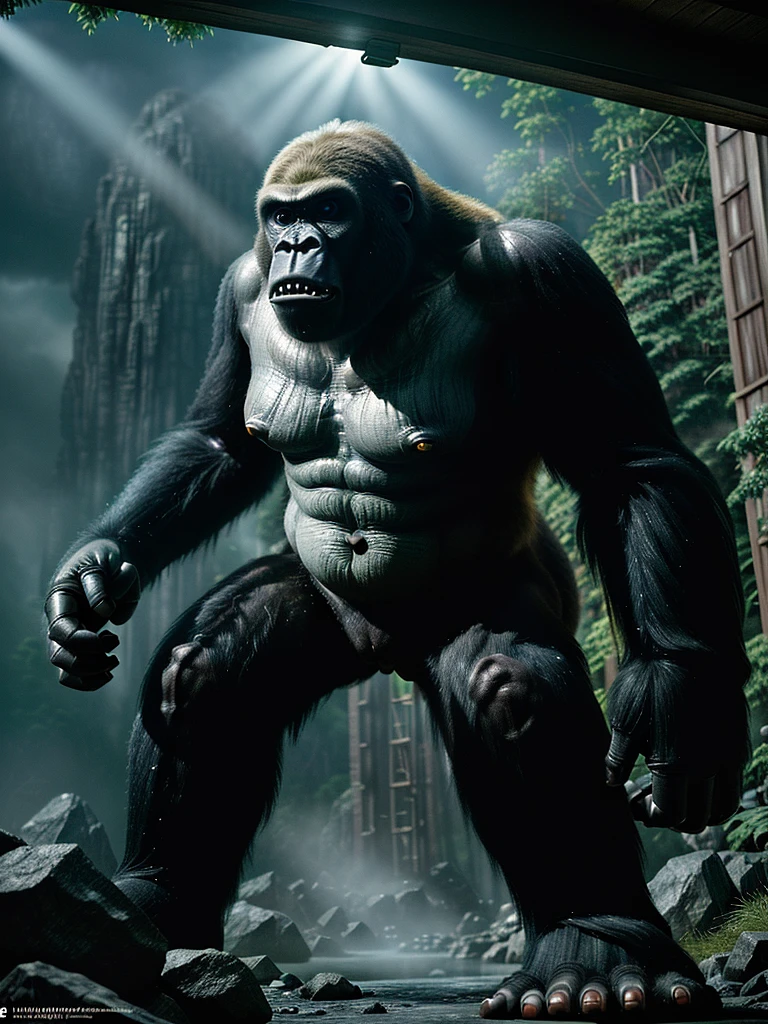 Photo of a ultra realistic King Kong movie scene, bright light, cinematic lighting, battered, low angle, trending on artstation, 8k ultra HD, hyper realistic, focused, extreme details, unreal engine 5, cinematic, masterpiece, art by studio ghibli, intricate artwork by john william turner