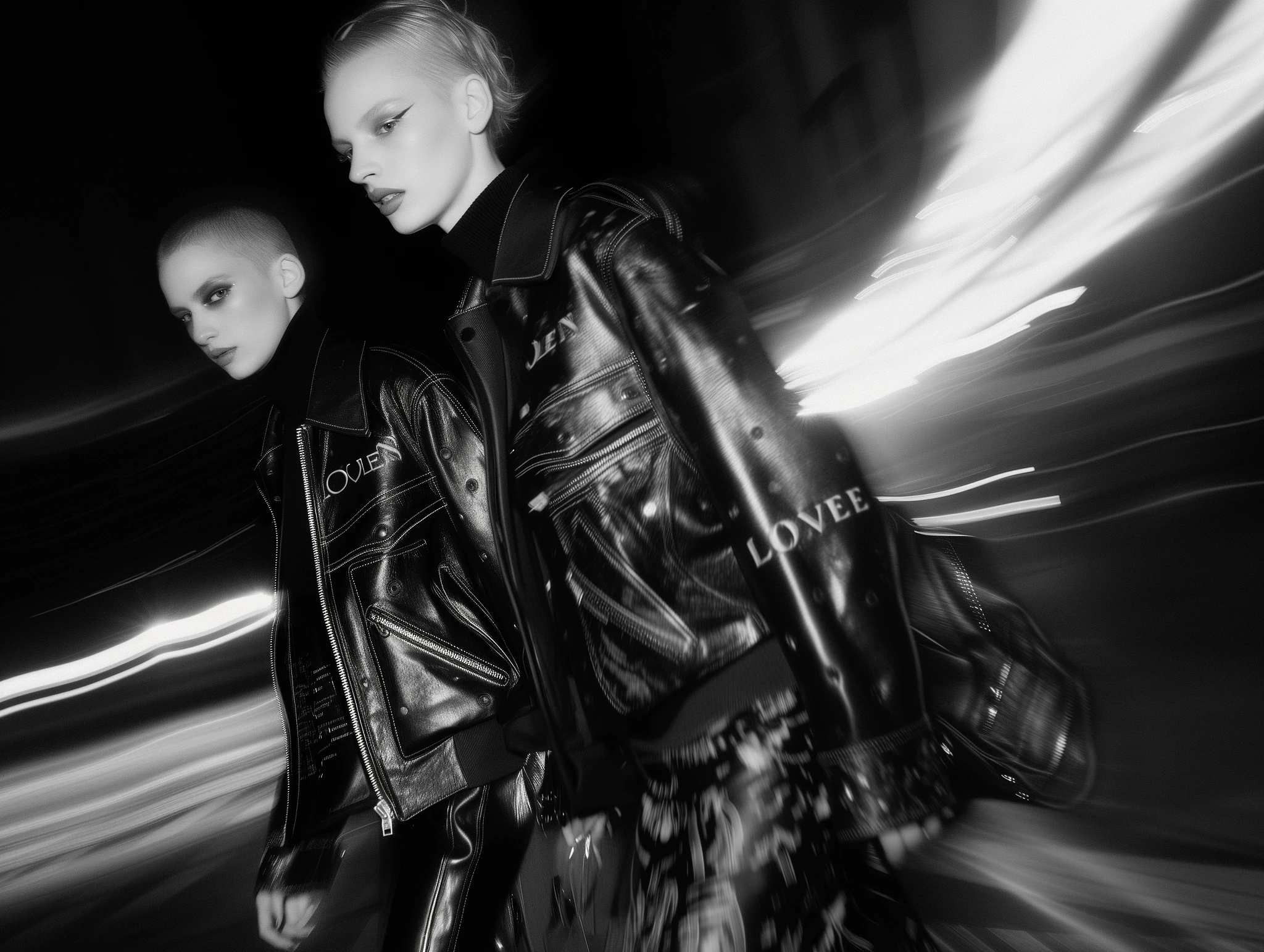 black and white, 2 models dressed black leather jacket, Soft stretchy high color long-sleeved turtleneck underneath, big millitsry pocket on both side of jacket, motion blur as the backdrop, saddles's pattern print, Loewe Fall 2023 Ready-to-wear, surrealism, Ellen von Unwerth , 50mm lens, full body views --ar 4:3 --v 6. 0 --s 50