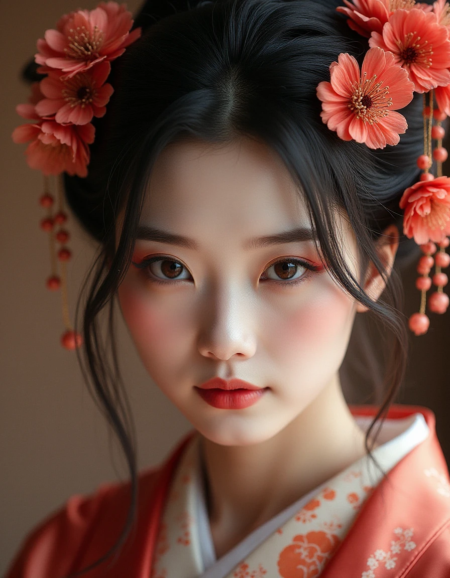 Beautiful Japanese woman, porcelain skin, flawless and radiant, ethereal beauty, monolid eyes dark and deep, captivating gaze, elaborate eyeliner accentuates their allure, arched eyebrows convey tender expressions, lips are softly colored, Adornments of silk kimonos and ornate Cherry blossom hairpieces add depth to her enchanting visage
