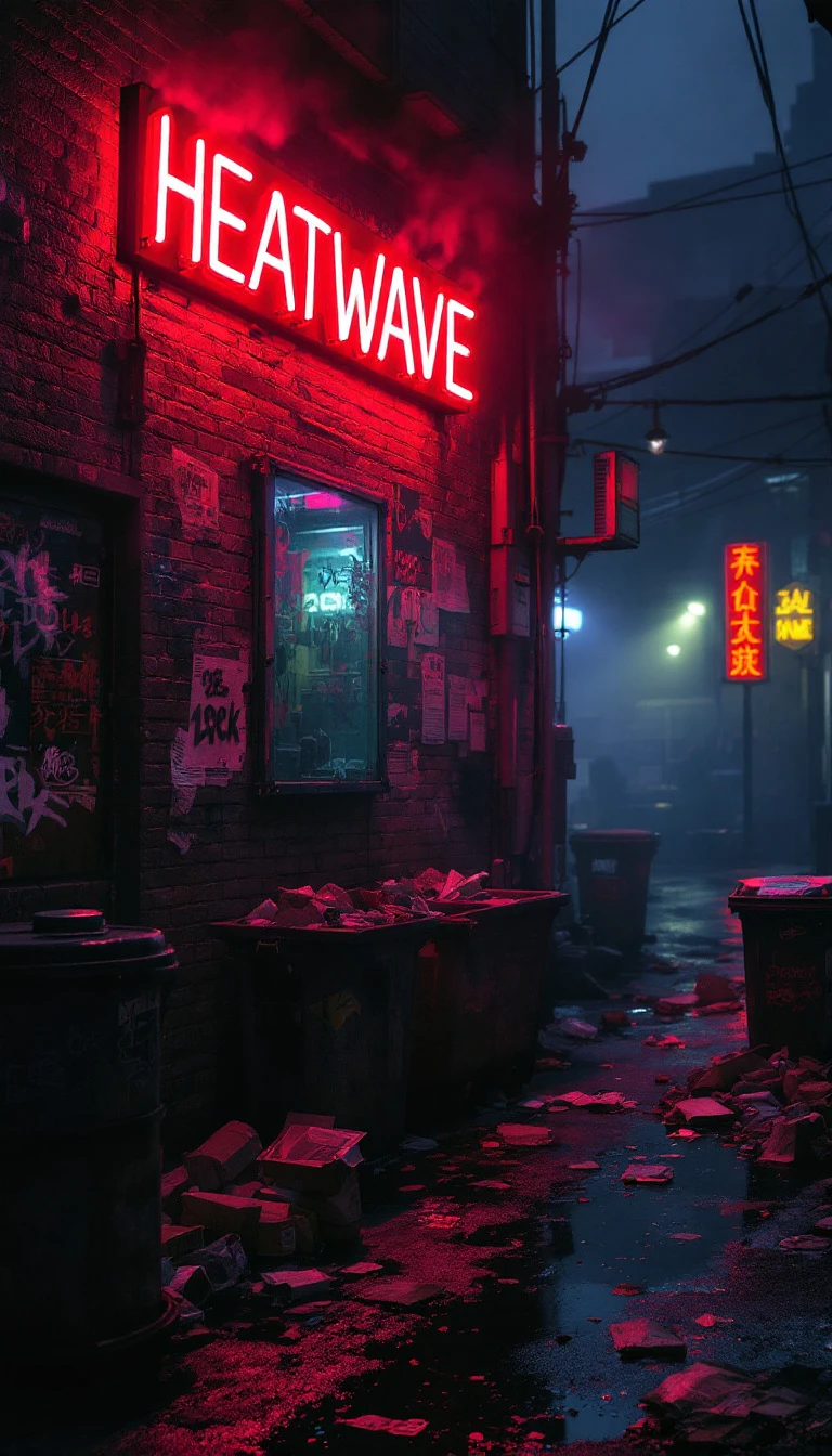 A hyperrealistic 1980s-style cinematic scene set in a dark, grimy alleyway that blends the neon-drenched streets of Tokyo with the gritty aesthetic of 80s USA. High on a weathered brick wall, a flickering neon sign reads 'HEATWAVE' in bold, retro lettering. One of the letters falters, casting erratic pulses of light that amplify the chaotic atmosphere. The wall beneath the sign is heavily defaced with graffiti, grime, and old torn flyers, with remnants scattered across the wet, trash-strewn ground. In the foreground, rusted trash cans and overflowing dumpsters line the alley, spilling garbage onto the pavement. Soggy newspapers, shattered bottles, and discarded fast-food containers mix with the oily puddles and streaks of mysterious stains. The air is thick with swirling fog, partially illuminated by the neon glow and hazy beams from distant streetlights. Adding to the chaotic scene is a classic 80s telephone booth, its glass panels cracked and smeared with grime. Leaning casually against it, a group of hookers dressed in vivid, retro outfits flirts with a slick-looking pimp in a purple suit and wide-brimmed hat. A few vintage cars, straight out of Miami Vice, are parked at awkward angles nearby, their chrome bumpers gleaming faintly under the dim light. Striding confidently through the alley is a man dressed in a white linen suit with a pastel-colored shirt underneath, mirroring Sonny Crockett's iconic style. He walks a leashed crocodile with casual ease, its sharp teeth glinting in the faint light. The man carries a pistol in a shoulder holster, the leather straps visible against his stylish attire. His sockless loafers splash through the puddles as he scans the surroundings with an air of calculated coolness. The atmosphere is alive with tension and intrigue, blending the neon-soaked allure of 80s Tokyo with the crime-infused grit of an American action drama. Every detail, from the slick streets to the eclectic characters, captures the cinematic spirit of an iconic 80s action film set.