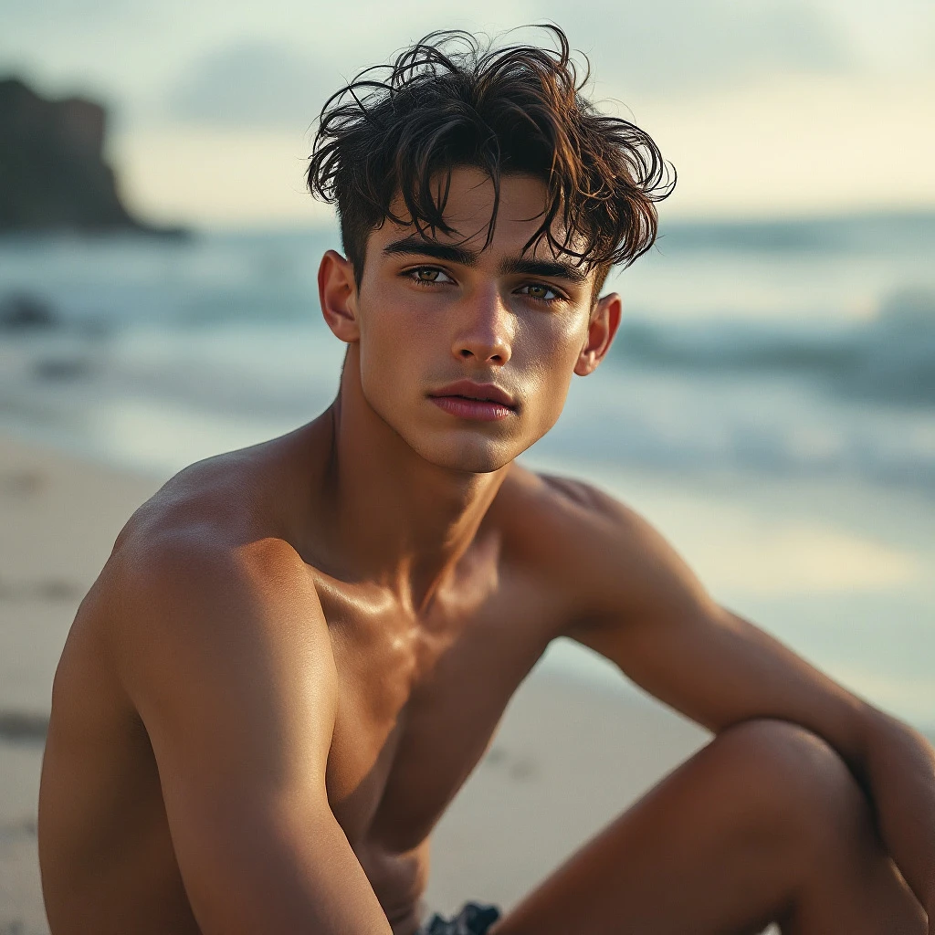 A 20-year-old man with very thin, brown eyes, dark brown short hair, with striking yet soft facial features, sitting on the beach and looking dreamily into the camera Instagram 8k realistic 5 fingers