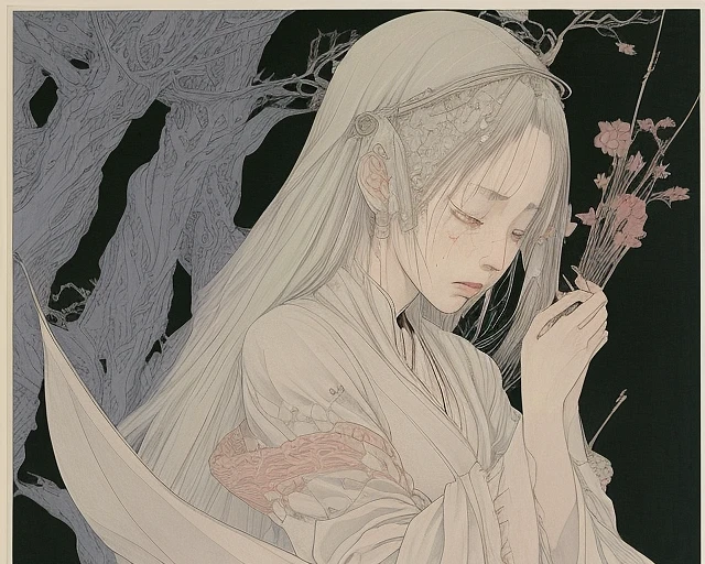 a woman crying, artwork by Takato Yamamoto and Chika Yamada, very detailed, futuristic, fairylike