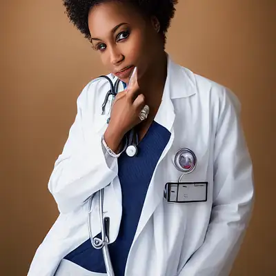 photography, high quality, portrait of black woman, white coat, intricate, beautiful and elegant, highly detailed, face detailed, half body detailed, smooth, sharp focus