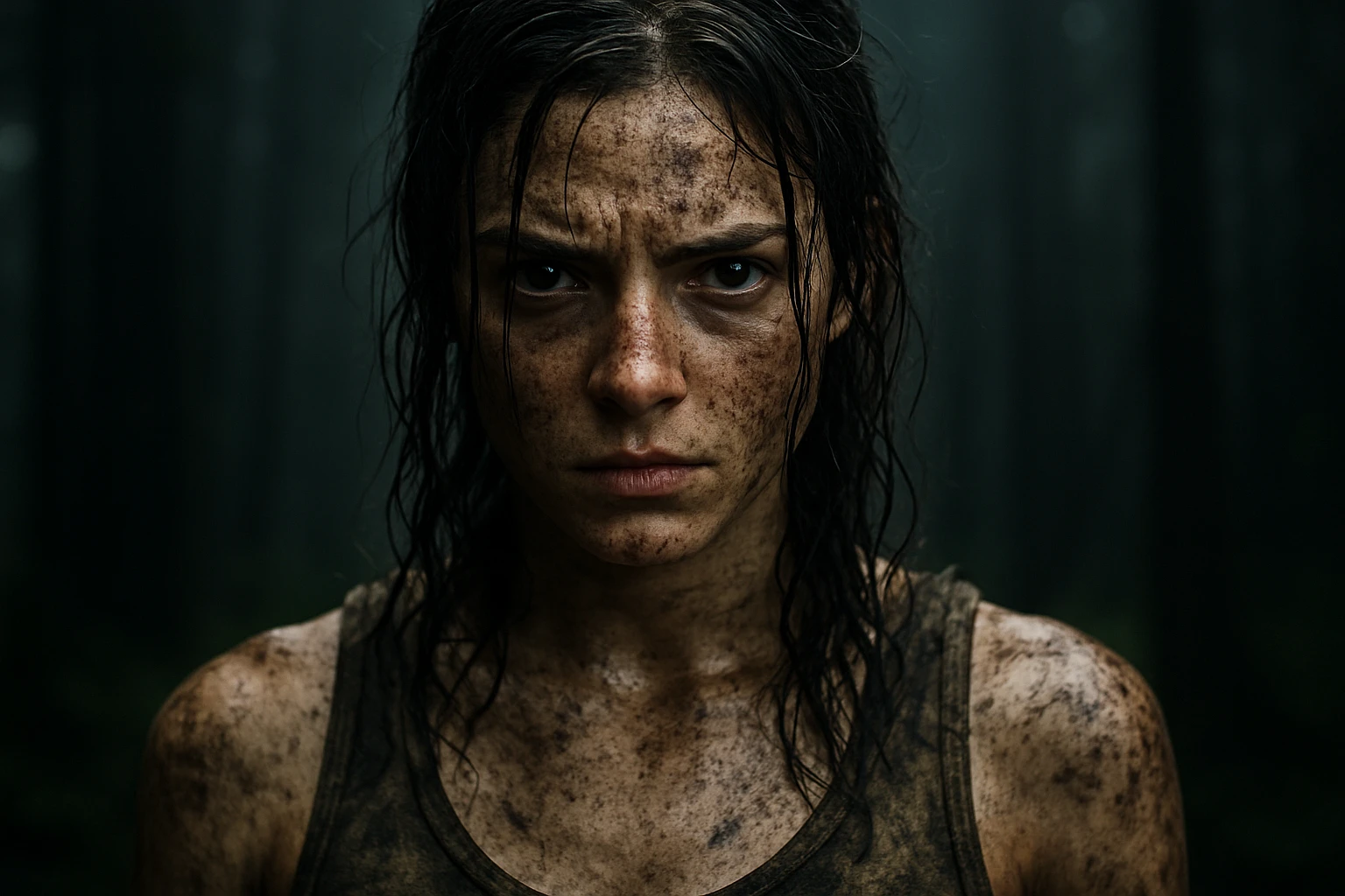A close-up portrait of a young woman with a fierce, determined expression, her face and body smeared with dirt and mud, wet disheveled hair clinging to her face and neck, wearing a tattered, mud-stained tank top. The setting is a dark, misty forest in the background, creating a moody and intense atmosphere. The lighting is soft and natural, emphasizing the raw emotion in her eyes and the texture of the dirt on her skin. Photorealistic, high detail, cinematic style, dramatic composition.
