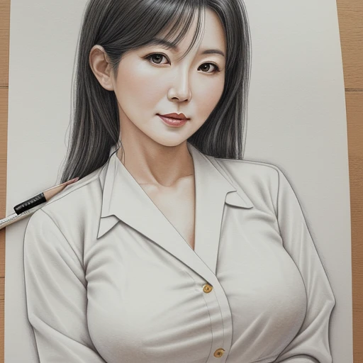 masterpiece, raw photo, realistic, milf mother mature japanese, uniform korean, light natural tones , pencil drawing , watercolor drawing