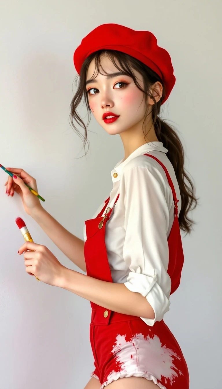 full body view of a Woman (Ethnicity: 1.0) , (Age: 20) , (Clothing Details: 1.2) , (Accessories: 1.2) , (Facial Features: 1.3) , (Expression: 1.2) , (Body Type: 1.2) , (Pose: 1.2) wearing a red beret, a white blouse and red shorts with suspenders, painting a white wall a white wall with a brush, detailed hair and eyebrows, fair and bright skin stained with color spots, delicate makeup with red lips, slender body, bare feet, beautiful feet only 5 toes on each foot natural light, comic style, digital painting, photorealistic skin texture, 3/4 view, (Detailed Clothing Folds: 1.1) , bright colors and soft lighting, strong shadows, thin wall texture, elegant, comic art, upper body slightly leaning towards the wall, slightly posing; Artistic style, highly detailed illustration, hyper-realistic style, detailed shading, realistic background.