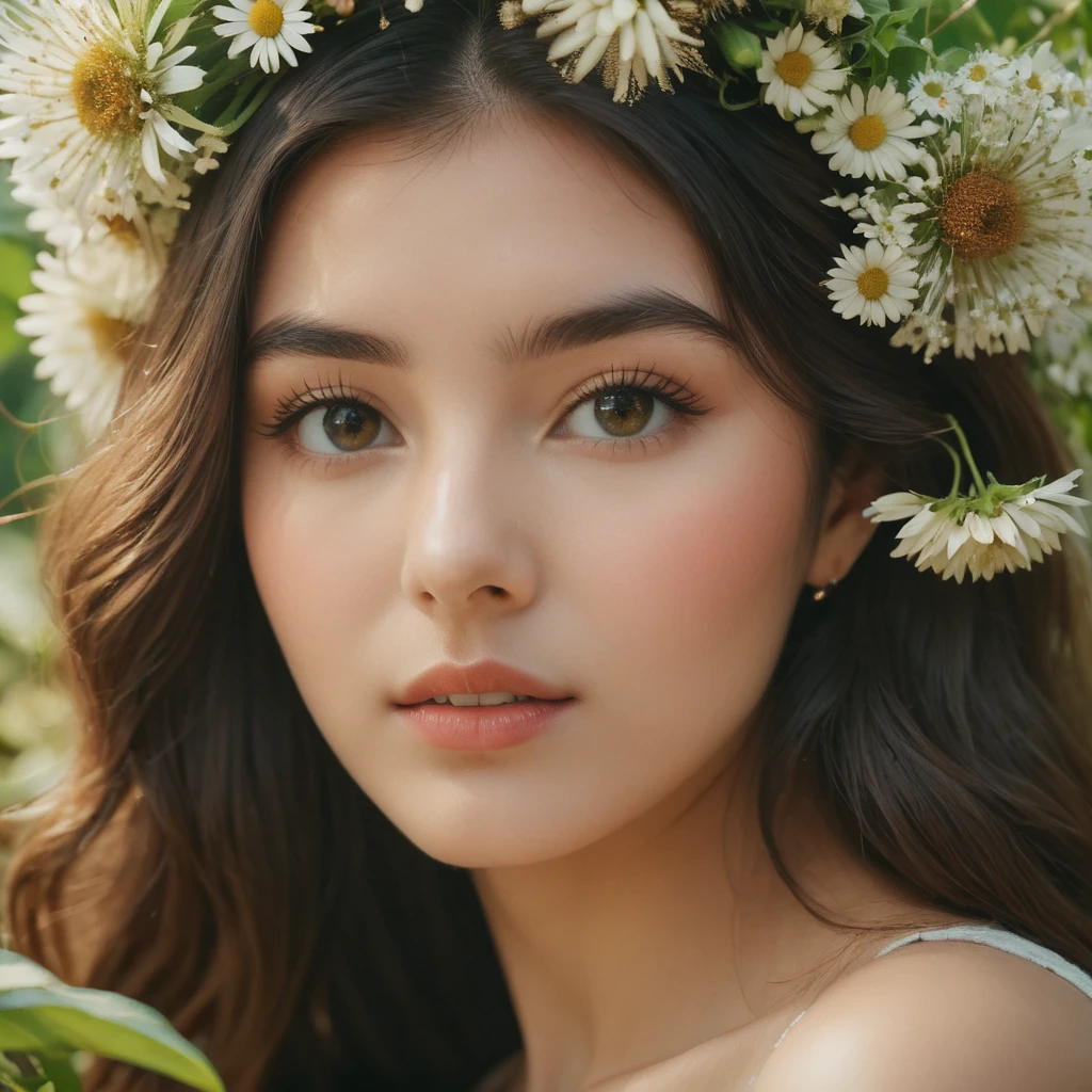 A 3 d close up image of a beautiful young women looking at the camera surrounded by lush flowers impressionism, pop , 8k, highly detailed