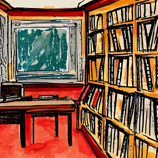expressive gouache and ink illustration of an interior view, study room library, open shelf layout