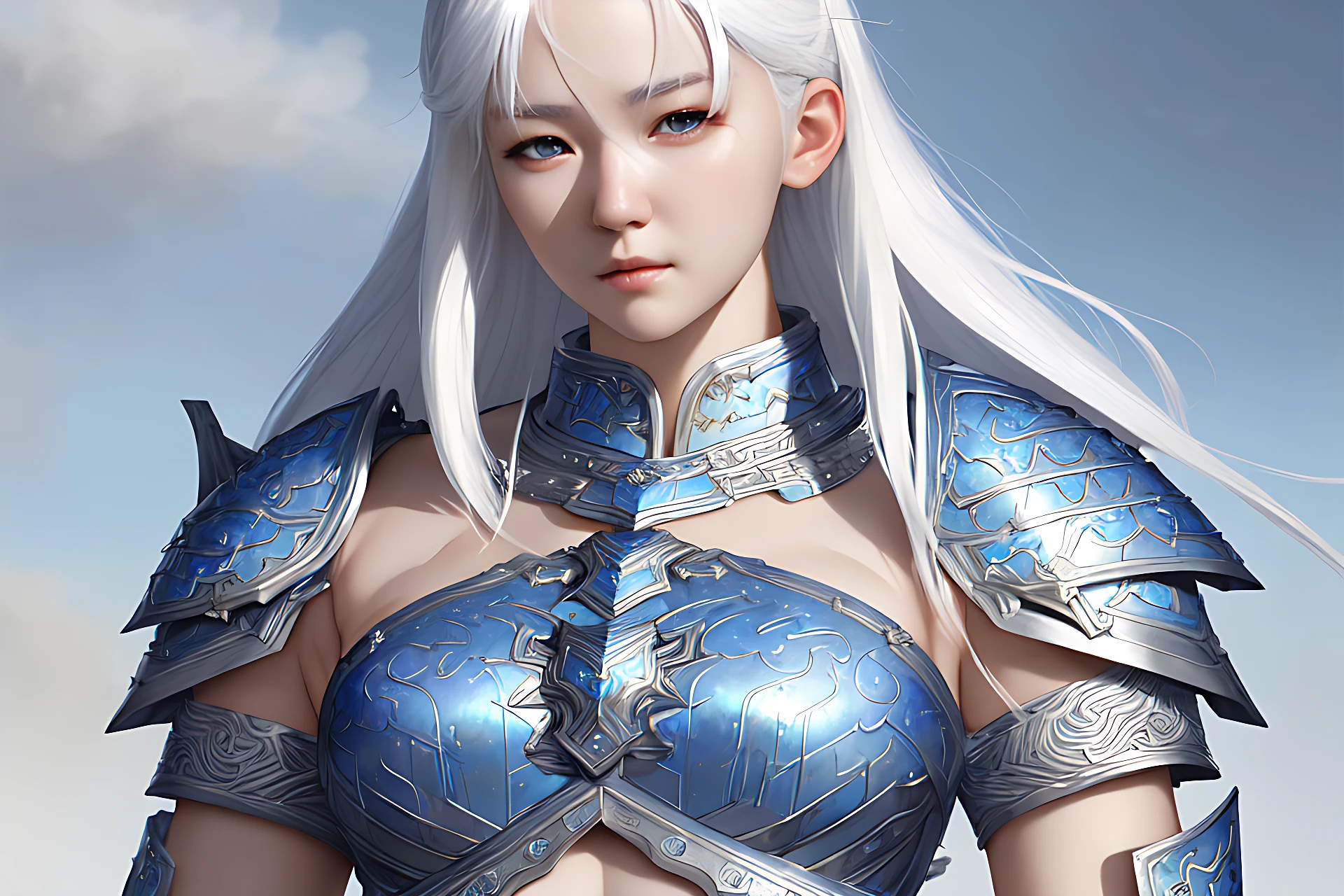 white hair, intricate azure armor, detailed gorgeous face, beautiful young South Korean girl, medium length white hair, toned stomach, showing midriff, Hyperrealism, by Greg Rutkowski, 8k