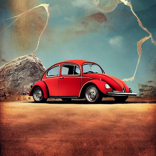 vw beetle vintage poster, in the style of rustic simplicity, gritty reportage, kombuchapunk, rusty debris, hyper-realistic animal illustrations, red and amber, wide lens --ar 73:92 --stylize 750 --v 6