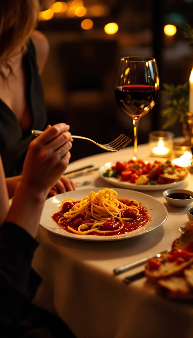 A sophisticated evening scene in an upscale Italian restaurant. A woman sits at a beautifully set table, wearing an elegant dress, though only her hands and a small portion of the fabric are visible. Her hands rest gracefully on the table, one holding a glass of red wine while the other delicately twirls pasta on a fork. The table is adorned with a plate of freshly made pasta with rich sauce, a side of bruschetta, and a small dish of olive oil and balsamic vinegar. The dim, golden-hued lighting reflects the warm and intimate ambiance of the restaurant, enhancing the luxurious atmosphere. The focus is on the fine dining experience, with an authentic, natural feel, capturing the essence of a refined Italian dinner.