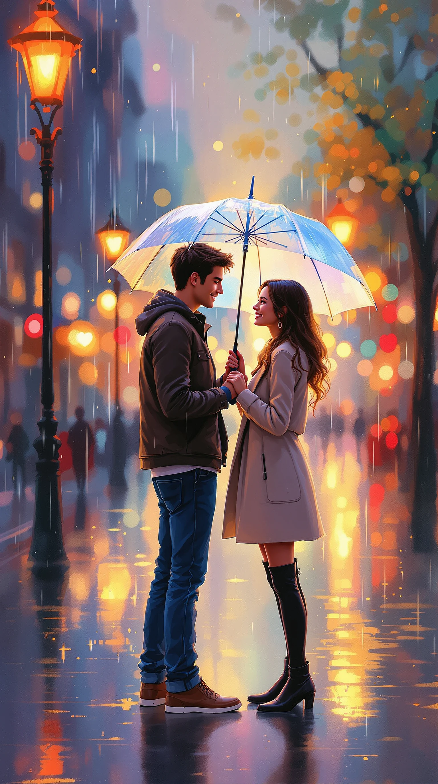 A Neo Impressionist style depiction of a romantic scene with a young couple sharing an umbrella under the rain in an urban setting. The artwork uses soft, expressive brush strokes and vibrant colors to create a dreamy, almost blurred effect. The man is in a casual jacket and jeans, and the woman wears a stylish dress and light coat. They stand close, smiling at each other under the shared umbrella, capturing an intimate moment. Raindrops and the wet pavement are illustrated with soft dabs of light and color, blending with the glowing streetlights and reflections. The background cityscape is impressionistic, with blurred edges and warm, glowing hues, creating a serene and slightly magical atmosphere.