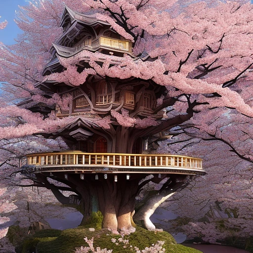 THE CHERRY BLOSSOM TREE HOUSE :: beautiful ornate treehouse in a gigantic pink cherry blossom tree :: on a high blue grey and brown cliff with light snow and pink cherry blossom trees :: Roger Deakins and Moebius and Alphonse Much and Guweiz :: Intricate details, very realistic, cinematic lighting, volumetric lighting, photographic, --ar 9:20 --no blur bokeh defocus dof --s 4000