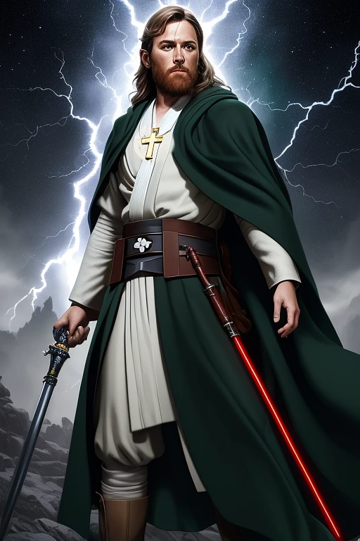 ((obi wan) ), ((jesus) ), on space, handsome, full body, walking pose, anatomical photorealistic digital painting portrait of a (old male) high elf (wizard) in (dark green silk cloak) , (fabric with intricate pattern) , casting a spell of (lightning) in a (dark and moody universe) , (insanely detailed, bloom) , (warhammer style) , (highest quality) , Sally Mann, concept art, 4k, (analog) , (high sharpness) , (detailed pupils) , (painting) , (digital painting) , detailed face and eyes, Masterpiece, best quality, (highly detailed) , 8k, photorealistic, sharp, (perfect body) , realistic, real shadow, 3d