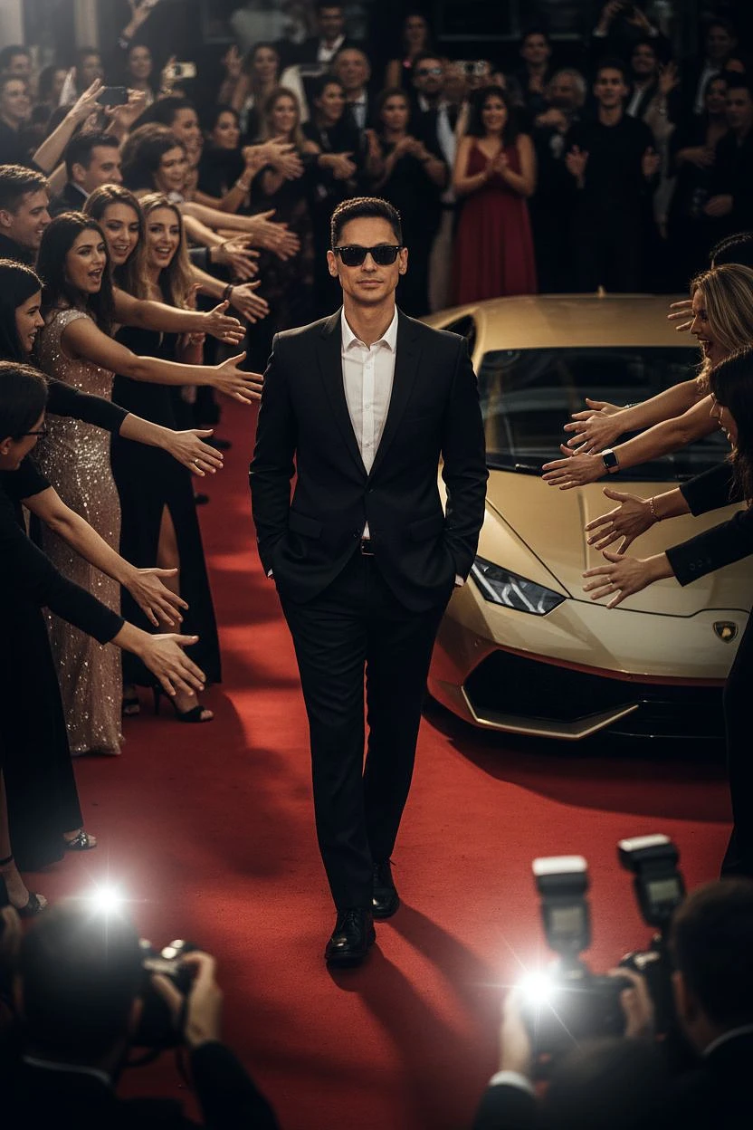 Generate a hyper-realistic, cinematic 8k image of the uploaded man with his face fully preserved. he is wearing sleek black sunglasses and a sharp black tailored suit, walking confidently on a red carpet in a natural motion. his hands are in his pockets, exuding calm authority and celebrity vibes. surrounding him are excited fans and glamorous women reaching out to touch him, while journalists’ cameras flash from below the frame, adding intense energy and drama. a luxury lamborghini is parked right beside the red carpet, enhancing the high-status atmosphere. the setting should feel crowded, dense, and cinematic, with rich lighting, dramatic shadows, and the color grading of a high-end sony a7s4 camera shot. aspect ratio 9:16 for vertical cinematic framing.