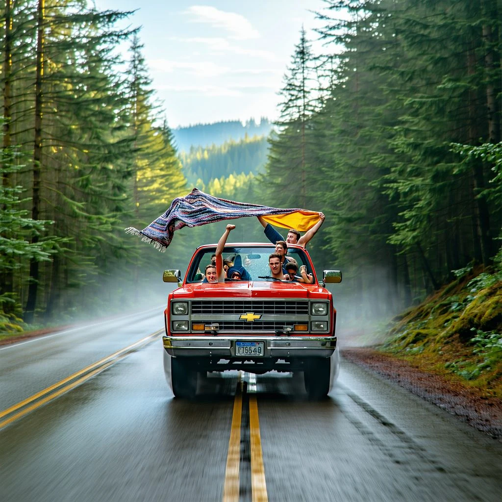Drone perspective close-up of a 1970’s Chevy pickup truck driving down a scenic royal highway in the woods, several teenagers in the back, one teenager with a beach towel, pops up the towel into the wind, gets pulled out of the truck like a parachute, vibrant and dynamic scene, detailed, dramatic lighting, photorealistic, high detail, 8k Negative prompt: text, logos, watermarks, out of frame, ugly, extra limbs, extra hands, extra feet, extra fingers, bad anatomy