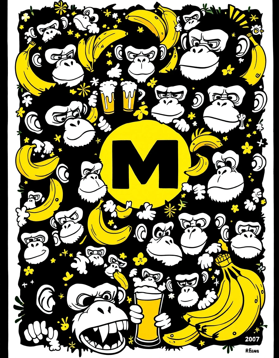 An intricate and mainly black, white, yellow, green, (two contrasting, extra colors for details) , graffiti-style poster featuring various elements, such as cartoon characters, symbols of urban culture, and dynamic expressions, focusing on minimalistic chimp faces, the letter 'M' inside a large circle, bananas, beer, is part of the image. the word 'Mannkeys' and '2007' is hidden --ar 63:128 --stylize 750