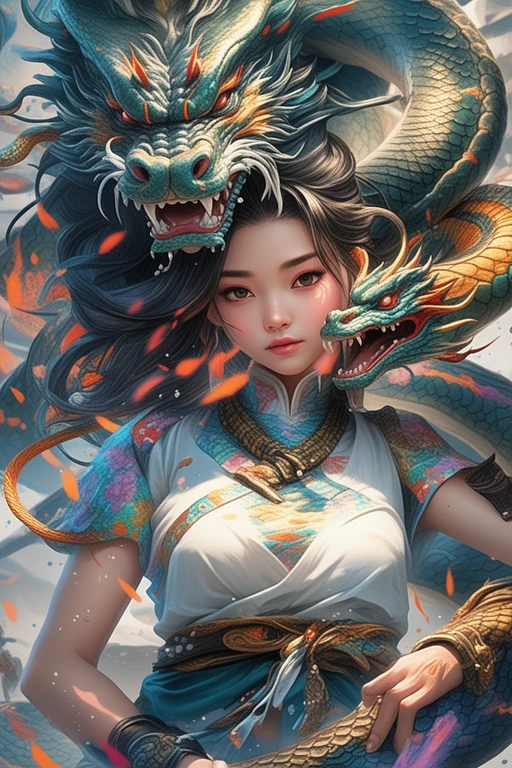 showcase the magnificence of Orochi, colorful masterpiece, 1girl, extremely detailed snake with dragon head, fantasy art, whimsical, splash art, explosive splashes, ultra detailed ambient, sharp focus, best quality, centered, colorful splash, chinese style, legend of orochi,