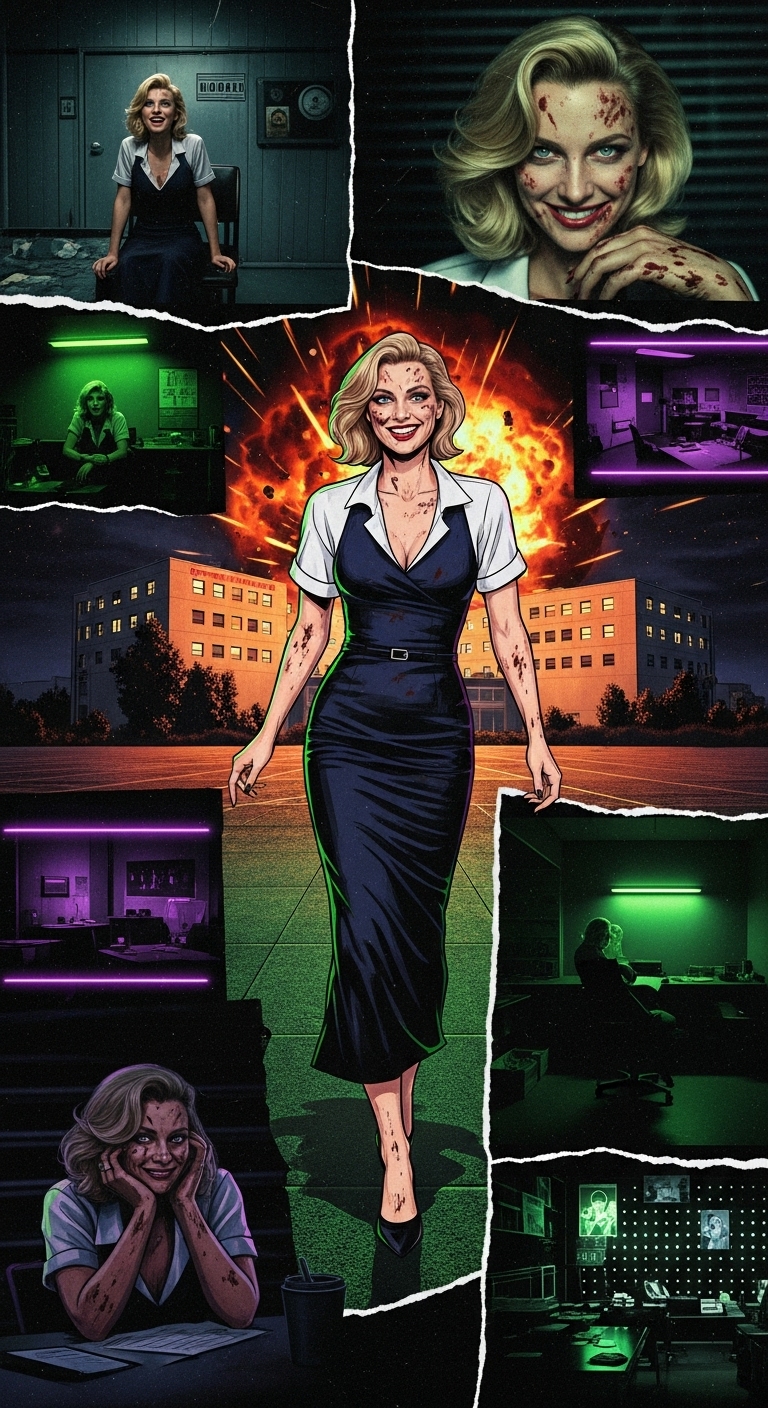 A retro vintage collage design of a blonde woman. The central image shows her walking in her elegant dress outfit with a twisted smile, in front of a hospital exploding. Surrounding this main scene are smaller images in collage style: blonde woman sitting in the dark interrogation room, close-ups of her smeared dirt, and shots of an office at night. The atmosphere should be dark and cinematic, with textures like torn paper, halftone dots, and grainy vintage poster effects. Neon accents of purple and green glow throughout the collage, symbolizing chaos and madness. The overall style is nostalgic 80s/90s poster art, bold, layered, and chaotic but balanced, like an underground street collage.