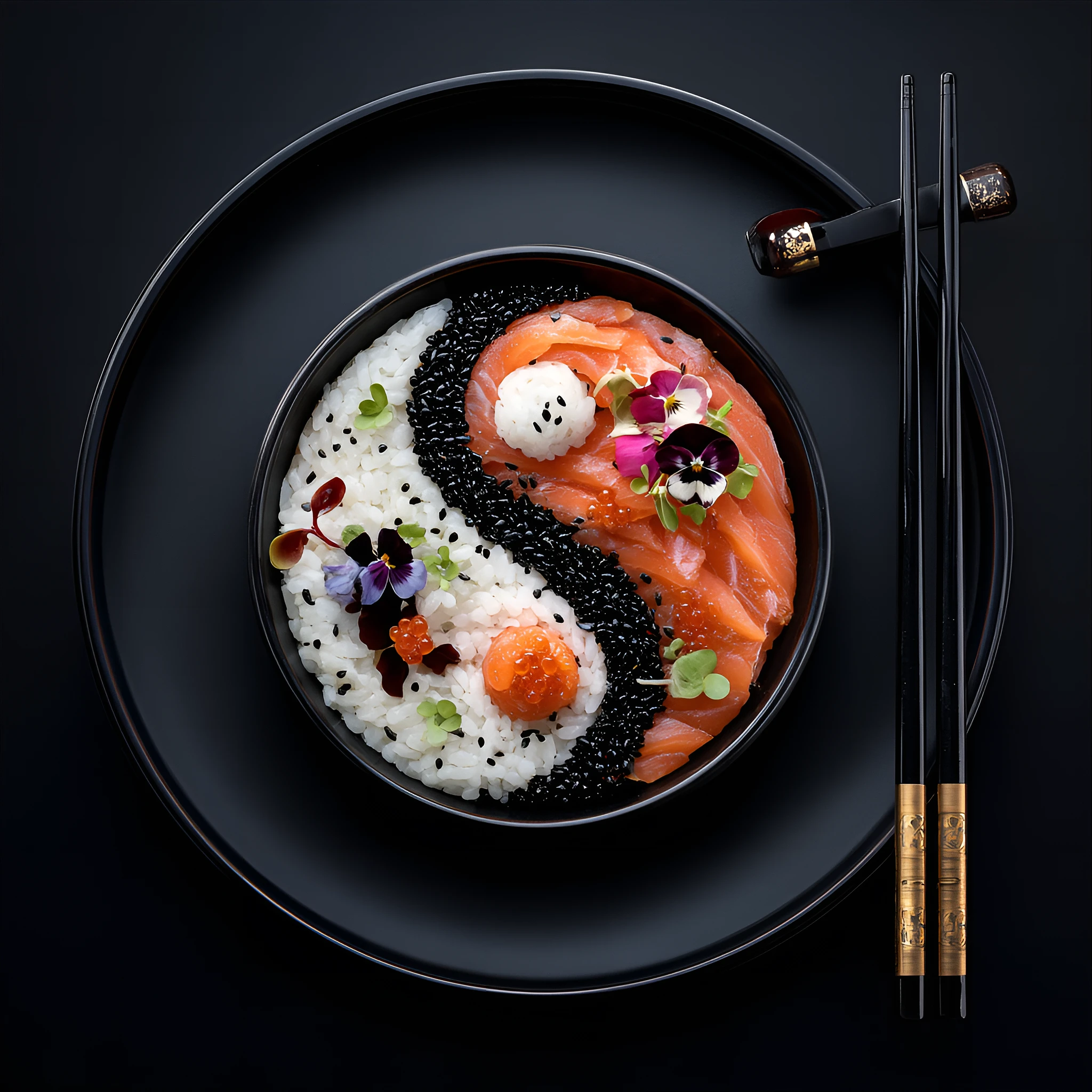 presents a beautifully arranged dish that artistically combines elements of Japanese cuisine with The composition is elegant and visually striking, blending culinary art with cultural symbolism. The main focus is a black bowl containing sushi rice and other ingredients arranged in One half of the symbol is made of pristine white sushi rice, while the other half is composed of a dark, likely seaweed-based ingredient, possibly black sesame or squid ink rice. The dividing line between the two halves is accentuated with a strip of fresh salmon, adding a vibrant orange contrast and a touch of luxury