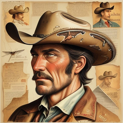 Very finely detailed 2-dimensional papar collage, featuring the face of a weatherworm western cowboy, close-up, The papers used to créate this collage are vintage and colorful, each piece shaped like an fly