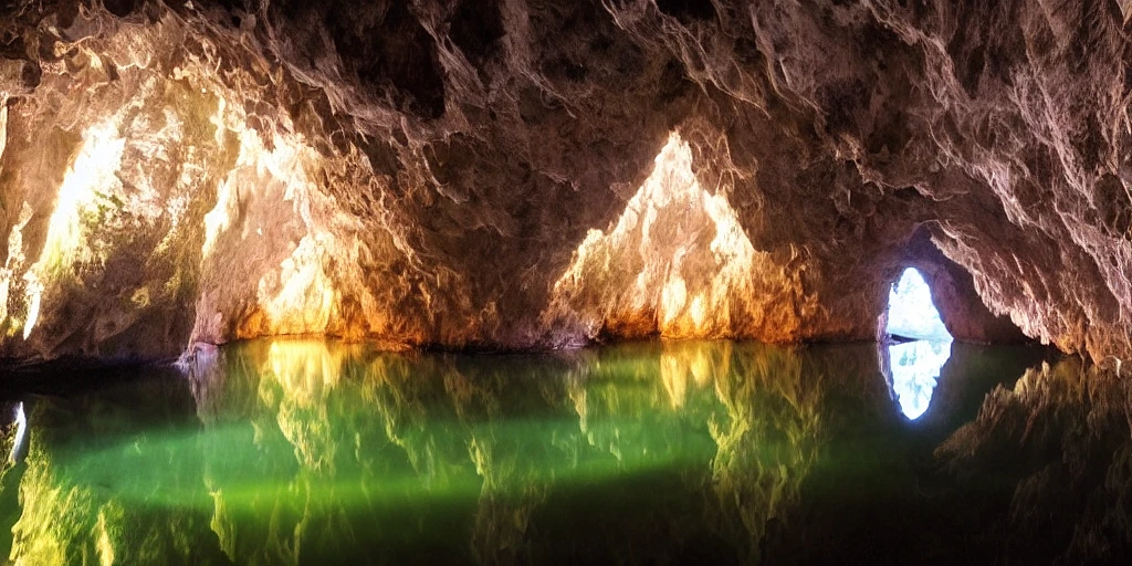 beautiful fairy tale tree in a cave, stunning lighting, phraya nakhon cave, stunning, magic, reflections water , god rays, hard shadows --ar 21:9 --q 2