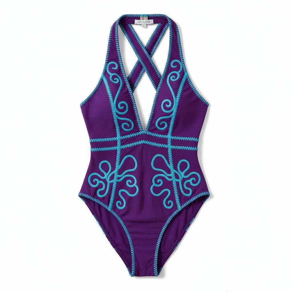 créame una imagen de un bañador de mujer con pespunte bordado a contraste, el color debe de ser purple. la imagen debe de ser para un portal de eccomerce por lo que debe de ser una imagen de un producto con fondo blanco