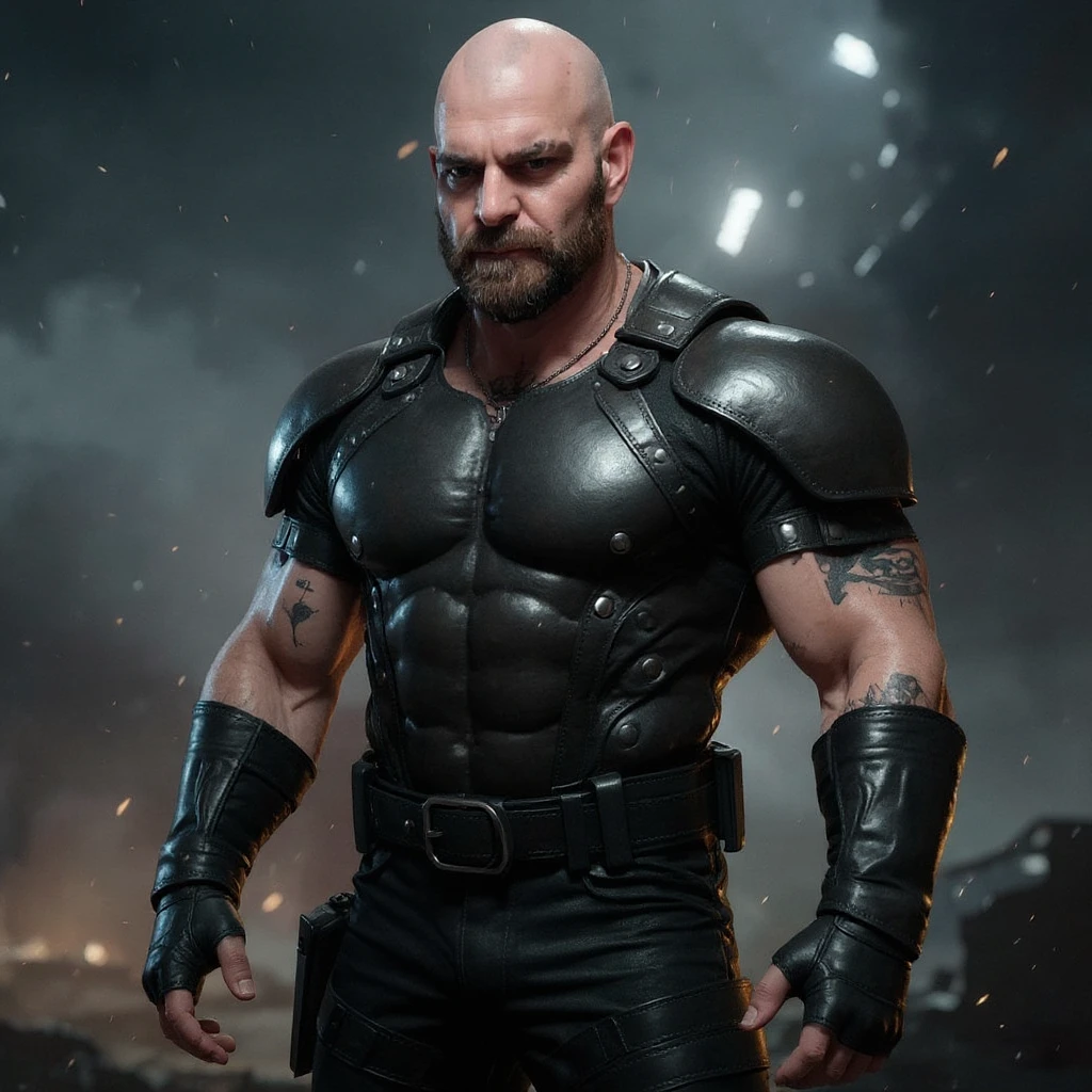Portrait en pied d’un homme massif, à la carrure surhumaine, debout dans une atmosphère chargée de brume et de tension électrique. Il est entièrement vêtu d’une combinaison moulante en cuir noir brillant, taillée au plus près du corps, révélant chaque muscle hypertrophié : pectoraux proéminents, bras énormes, taille étroite et jambes d’athlète. Son torse bombé est parcouru de coutures tendues et de reflets métalliques, comme une armure vivante. Ses gants sans doigts en cuir noir renforcent l’impression de combat imminent. Son visage est rasé de près, les traits durs et concentrés, les mâchoires serrées. Il affiche une expression de calme menaçant, prêt à l’action. Sa tête rasée sur les côtés, son regard perçant, et sa barbe courte soulignent l’aspect militaire, brutaliste et ultra-viril du personnage. Une fine chaîne noire se devine autour de son cou, et un tatouage tribal est visible sur son bras gauche, accentuant son identité d’homme de guerre ou d’anti-héros. L’arrière-plan est un brouillard dense, gris-bleuté, parcouru de lumières diffuses et de particules en suspension, donnant une ambiance de zone industrielle ou de champ de bataille futuriste. L’éclairage est froid et directionnel, accentuant les reliefs du cuir, les veines apparentes, et les contours du corps. L’ensemble évoque un univers à la croisée du cyberpunk, du cinéma d’action post-apocalyptique, et du fétichisme musculaire, avec une puissance visuelle volontairement excessive et théâtrale.