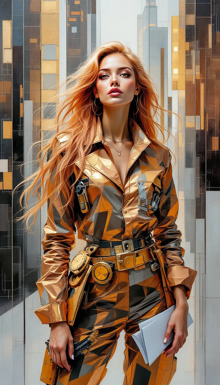 "Rose Gold Architect in a Mirrored City": A powerful abstract painting showcases an architect, with both precision and a love for complex design. She is a skilled builder, shown within a city of glass and steel, where the reflections seem to stretch endlessly in all directions, with tan skin, long, flowing rose-gold hair that seems to move with the light and reflections, and a sharp and practical outfit that seems to be constructed of hard angles and clean lines. Blueprints, rulers, and various other technical tools are attached to her hands and belt. The artwork skillfully combines modern abstract and character presentation, creating a dynamic and engaging scene that uses colors like golds, silvers, and whites. Her focused, amber eyes, the composition's focal point, convey both a sharp intellect and a powerful determination. After a long day of creating new visions, the architect embodies both ingenuity and a love for the precision of her craft. The sharp lines and detailed reflections invite the viewer to explore the hidden narratives within this vibrant work, rendered as a painting.